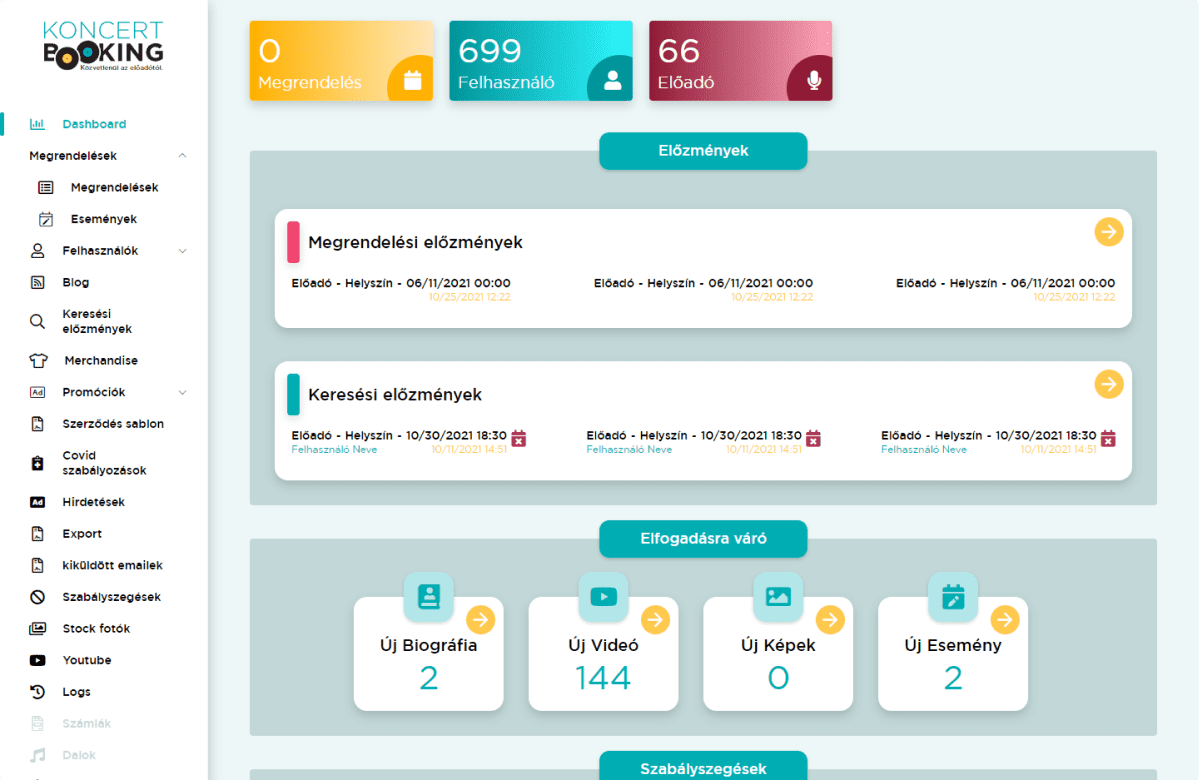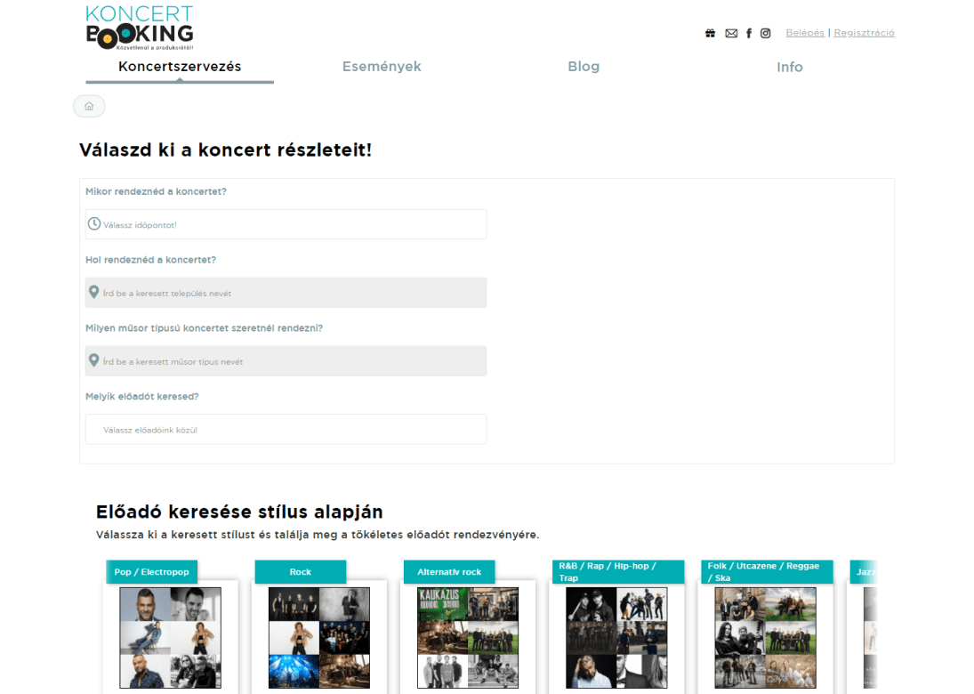 The already operating KoncertBooking.com is a booking site based on the booking sites in the travel market that offers performers in seconds for an event, and also calculates the actions they can take according to their existing activities. After the booking when the contract details are filled the customer can contact the performer directly. The performer receives a text message to it's phone and a notification in the application. After accepting the booking the customer receives the performer's own contract. The performer's interface of the platform is a professional concert organizing software that provides the same service and attention to a beginnes than to a professional. Koncertbooking.com is the digitized interface for all music industry activity.